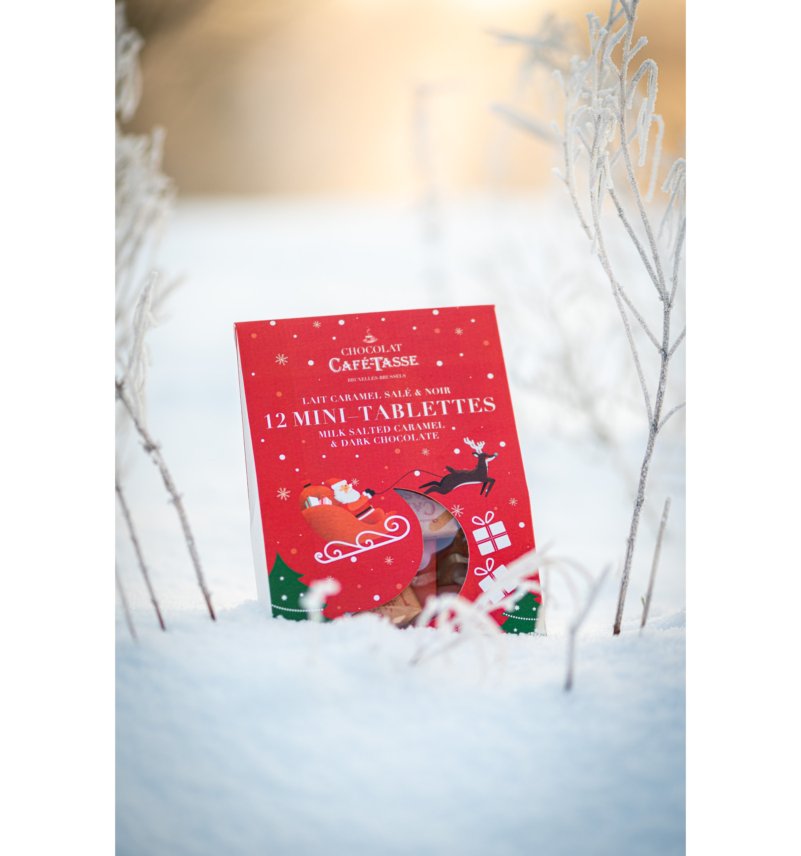 Bag Xmas edition with 6 mini bars milk chocolate salted caramel and 6 mini bars chocolate dark 60 % - 108 g