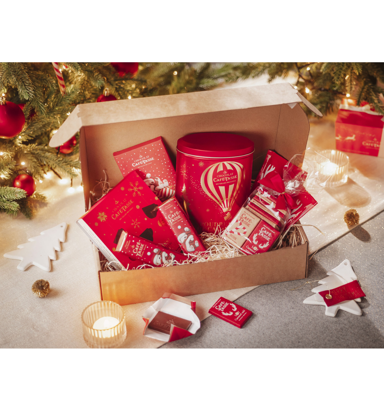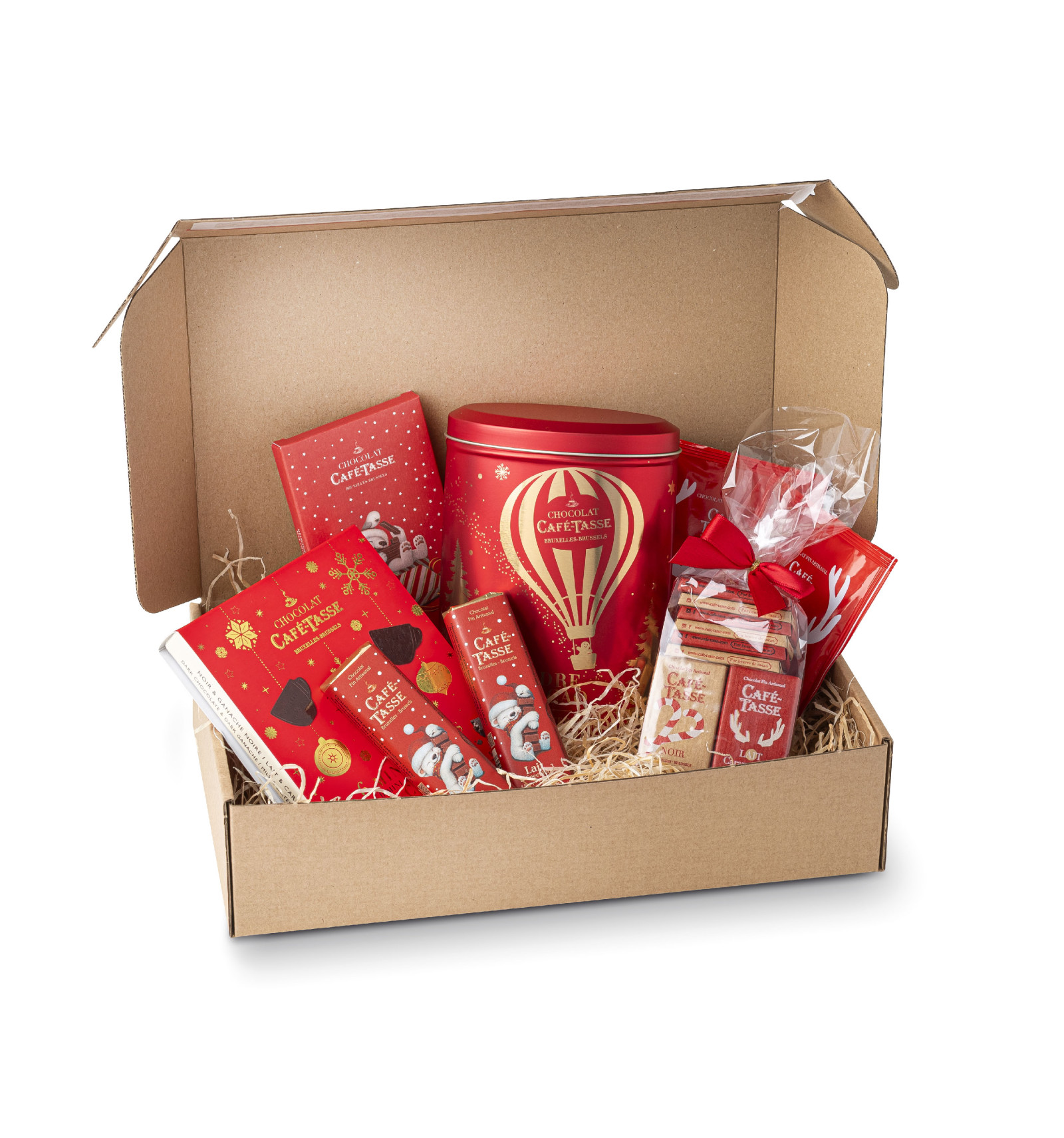1 doos met: 1 doos cacaopoeder kerst editie, 1 doos minicups kerst editie, 2 geassorteerde repen van 45gr, 1 zakje melk & caramel Chocomallows, 2 zakjes geassorteerde cacaopoeder, 1 tablet van 85gr, 1 verrassingszakje